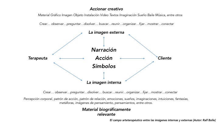 Entonces, las diversas formas de expresión de las imágenes externas e internas, se muestran en el espacio entre el terapeuta y el cliente como:
