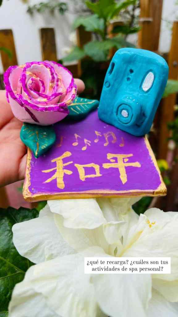 En la segunda sesión, se trabajó el espacio de paz personal. Surgieron varias imágenes y recursos. Hubo un proverbio chino que le resonó mucho: “La tensión es quién crees que deberías ser. La relajación es quién eres”. Debido a eso realizó un trabajo en arcilla el que incluyó actividades que la conectan con su armonía interior: el cuidado de plantas y la fotografía. Aquí cabe recalcar que la arcilla se utiliza como un elemento transformador en el Arteterapia debido a sus cualidades altamente manipulables y transformables a nivel háptico. Debido a esto me pareció super acertado cuando Ana intuitivamente escogió ese material para este trabajo. Según Macks (1990, como se citó en Via Rodríguez 2020) la arcilla despierta sentimientos de amor, respeto hacia uno mismo y felicidad. Otro beneficio del trabajo con el arcilla es que trae la mente al “aquí y ahora”. El tacto es un sentido que tiene una alta capacidad de devolver la mente al cuerpo, por eso nos permite reducir la mentalización y concentrarnos en las sensaciones corporales. Experiencia que Ana necesitaba y aspiraba: poder maternarse mejor. En su placa de arcilla escribió paz en chino y agregó notas musicales, las cuales también recordó la vinculan con su alegría de vivir.