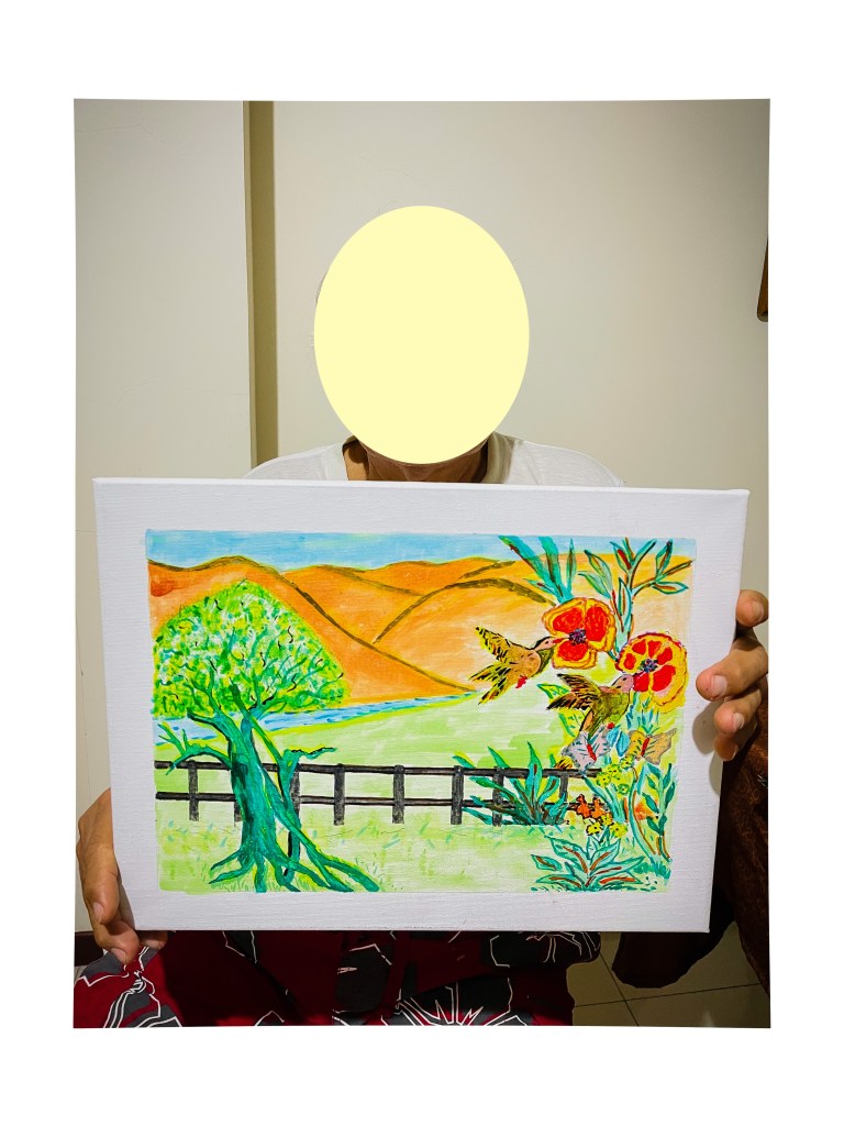 En la construcción de una máscara abordaríamos el tema de cómo cree que la gente la ve (parte externa máscara) y cómo realmente se ve a sí misma y se siente (parte interna máscara). Uno de los objetivos de este trabajo fue, tal como comentan las arteterapeutas Gioia Chilton y Rebecca Wilkinson (2016), emplear la creatividad para reducir la angustia y aumentar el bienestar. Finalizamos este bloque de tres sesiones terapéuticas, con duración de 2 horas cada sesión, con una pintura (imagen 3) donde trabajó su capacidad de cuidar y nutrirse a sí misma para luego poder entregarse a otros.