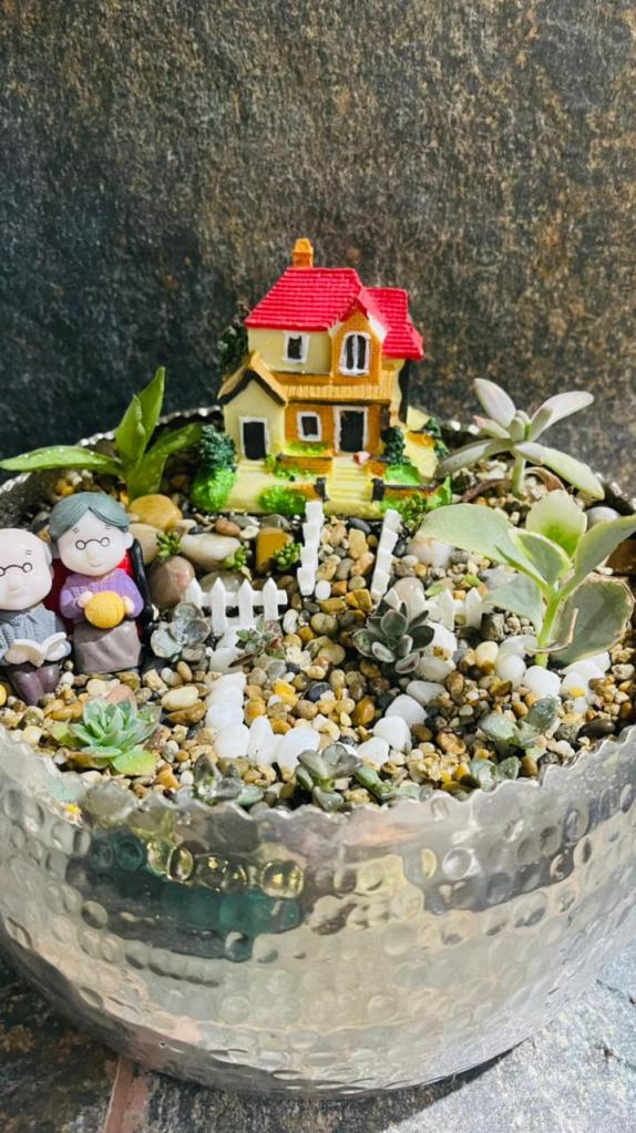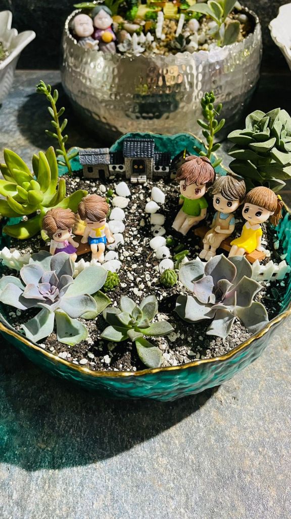 Los trabajos que se encuentran dentro de maceteros con suculentas son actividades que surgieron a posteriori, en el tiempo offline de terapia, pero que se enlazan con estos momentos de desconexión que encontró para sí misma, mundos imaginativos [mini creaciones como ella las llama] realizados con porcelana fría que habitan su ambiente casero. Como mencionaría la Arteterapeuta Sterleide Cassimiro de Carvahlo (2022, p.6), en este contexto, la terapia de Arte ayudó a una mayor fluidez en la expresión de sus sentimientos y en la comprensión de sí misma con su autoestima mejorada. El Arteterapia promovió la autopercepción y la estructuración emocional.